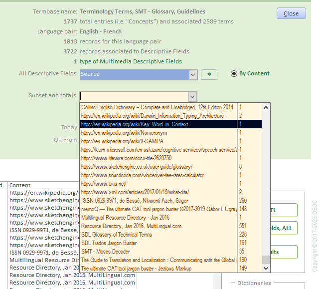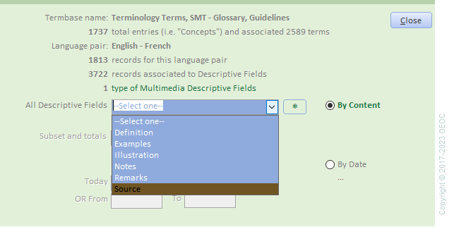 Once the application opens the Export Module, and if the Termbase being explored has Descriptive Fields, you can see them all in the blue pull-down list. Please note the difference between "All Descriptive Fields" and the "Descriptive Fields USED" (see the Export Module user interface).