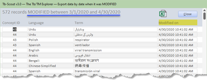 The result set includes, for each record, date and time, of course, Concept ID (to be linked, for instance, to a bilingual list), language name and the term in question.