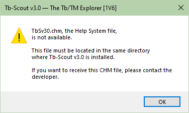 The Help System comes in the traditional .chm file format and it is named TbSv33.chm. This file must installed in the same directory where you install Tb-Scout v3.3 and if it is not, the message in Figure 2, above, will always show up.