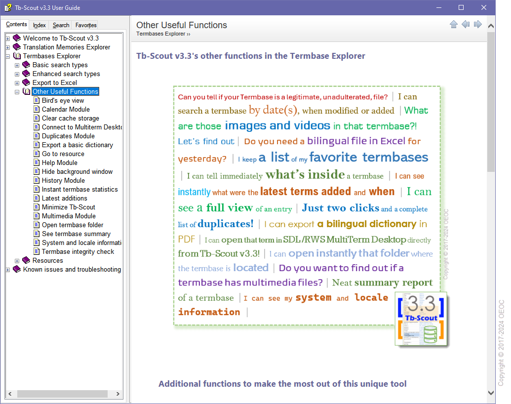 This Help System is in and of itself a useful manual to introduce translators, editors and students of language and translation studies to the world of terminology, particularly using the MultiTerm terminology system with the help a tool called Tb-Scout v3.3.