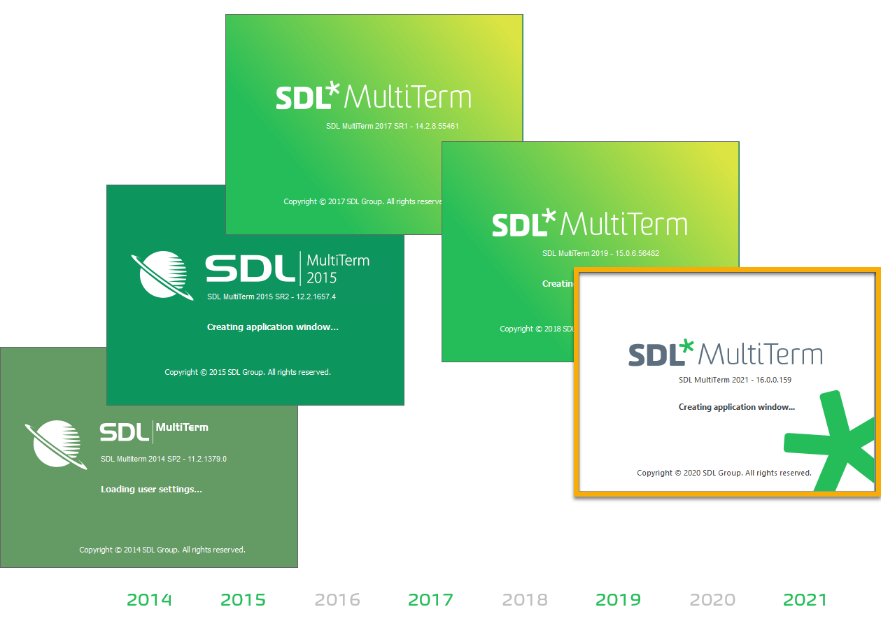 Starting with the new brand image established in 2021, MultiTerm will no longer have an SDL prefix. Below you can see the timeline of SDL MultiTerm in the last decade.